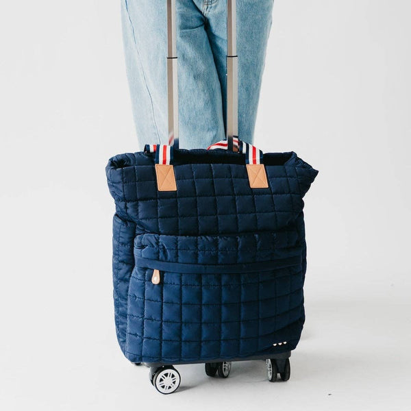 The Tenley Quilted Tote Roller Bag is the perfect accessory for the mover and shaker lifestyle. Featuring a dual handle, quilted puffer nylon tote bag that is stylish and super functional. The bag rests effortlessly on the included handle wheels by a trolly sleeve to easily wheel your bag around. The bag has numerous pockets and compartments, and the trolly includes 5 wheels, making it your new best travel friend! The bag comes in 4 fun colors with coordinating accent handles that make the bag pop!