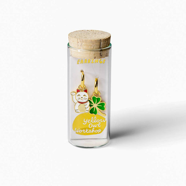 Hoop Earrings - Lucky Cat & Clover - Gold Shamrock
