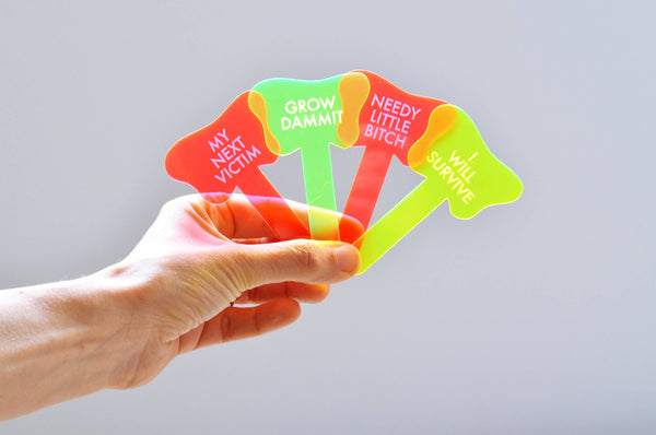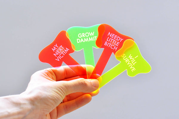 Tuff Talkin' Plant Stakes for watering reminders and encouraging growth. Made in NE Indiana with water-resistant acrylic material for longevity. Each thoughtfully designed plant marker is 4" tall.