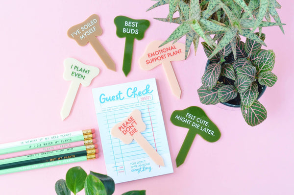 Tuff Talkin' Plant Stakes for watering reminders and encouraging growth. Made in NE Indiana with water-resistant material for longevity. Each thoughtfully designed plant marker is 4" tall. "PLEASE DON'T DIE" Peach/Red