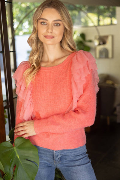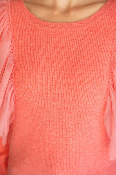 • Round neckline • Layered tulle detail • Long sleeves • Sweater top • Model height 5' 8”, wearing size Small