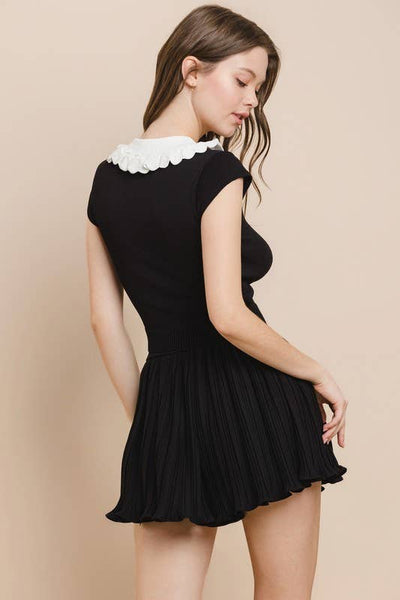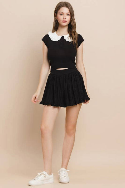 Short sleeve full fashion knit top with contrasting white ruffled knit collar.