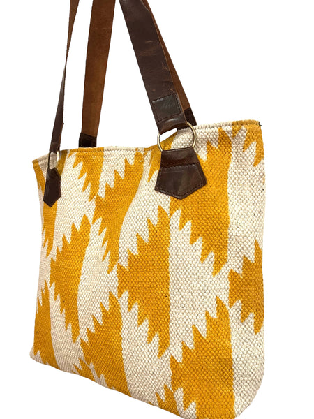 Blockprint shoulder bag/purse featuring pyramid design, leather strap, zip closure and one zipper pocket inside.