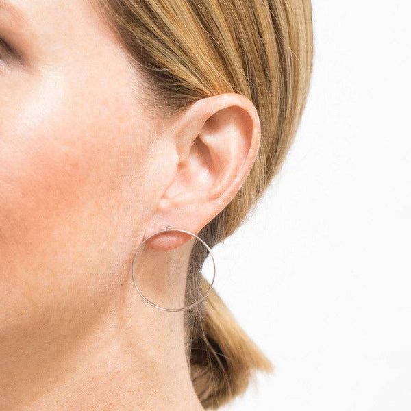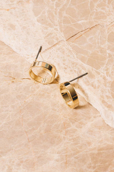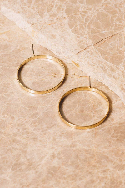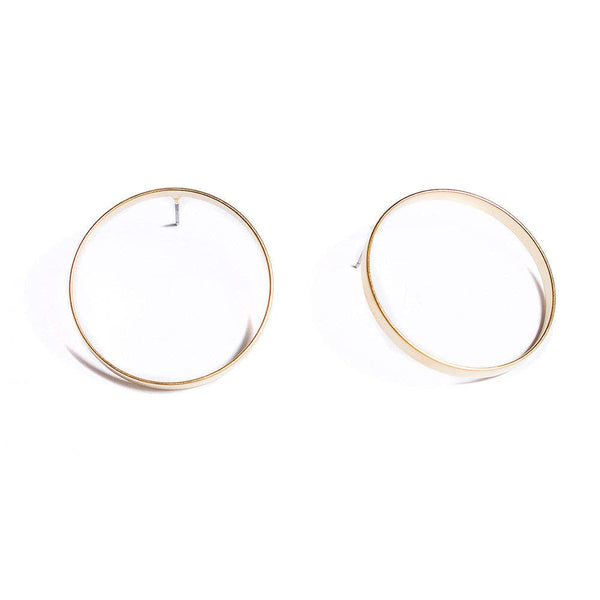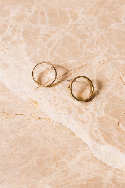 Gold circle shaped earrings. I designed these to sit sideways on your ear to show the negative space instead of a traditional hoop front to back.