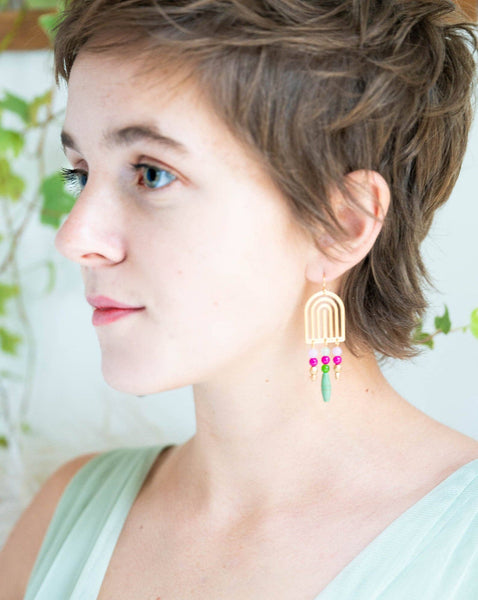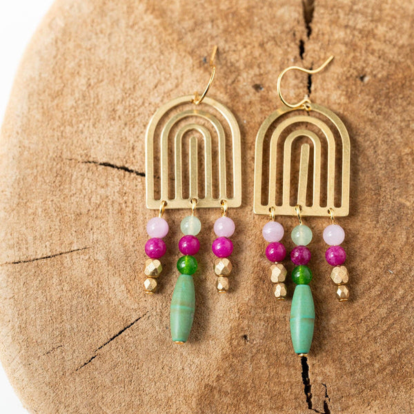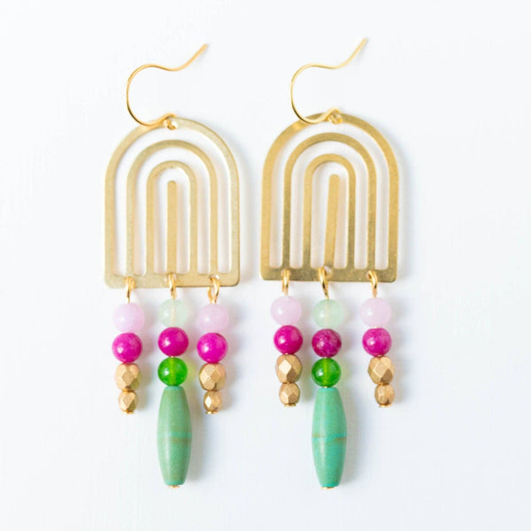 The 2" long earrings are made with an oval brass arch and three rows of beads that include turquoise magnesite, jade, gold glass, and colorful magenta dyed mountain jade.