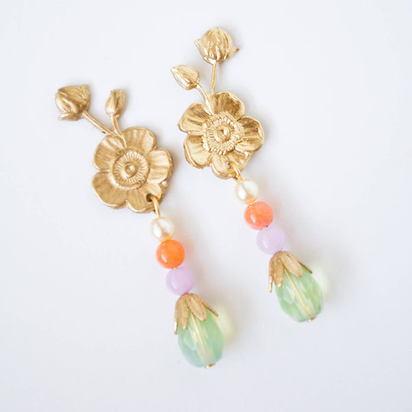A lovely pair of flower studs with a tiny Swarovski glass pearl, Coral and Rose Quartz stones, and a Mint Czech glass drop bead. The Earrings measure 1.5" long and the posts are 24K gold plated. Details: 1.5" long 10mm Brass flowers 4mm Swarovski glass pearl 4mm Corals 4mm Rose Quartz Czech glass mint drop bead 24K GP Posts Gold Plated Barrel closure