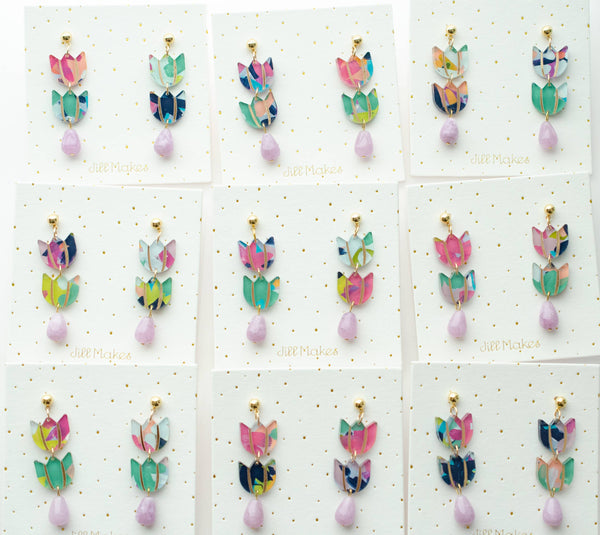 Earrings are cut from abstract hand-painted acrylic, so they will arrive mismatched! Because of this, we are not able to accommodate requests for specific colors or patterns.