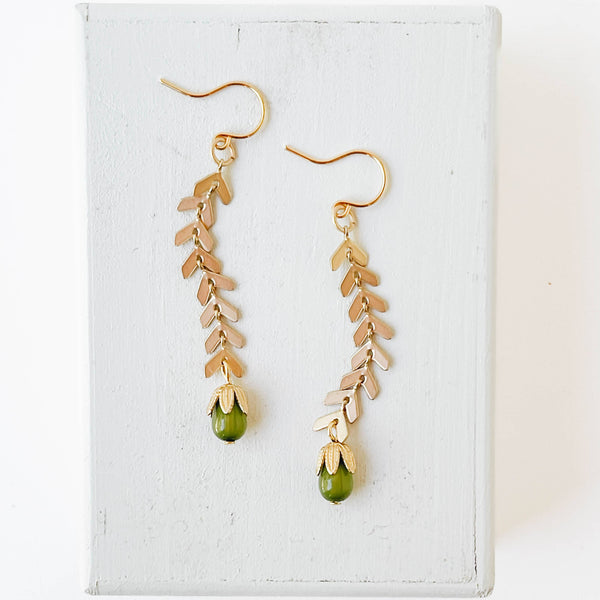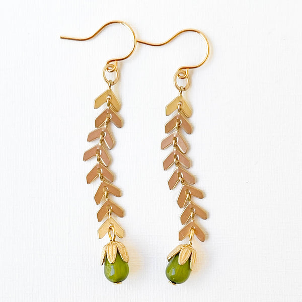 Dainty dangly 2" long matte gold plated Chevron earrings with an olive green drop bead and 24K gold plated ear wires.