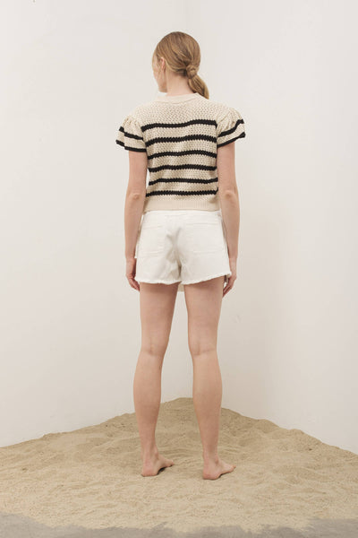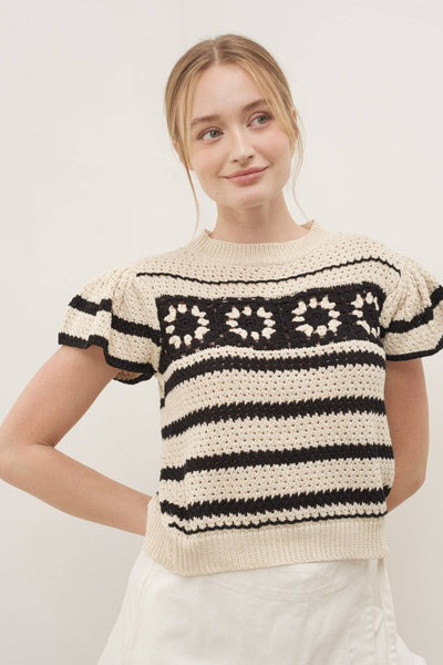 This handmade sweater with ruffle sleeves features open-knit crochet blouse in a striped design with floral details -Round neckline -Short flutter sleeves -Relaxed fit -Pullover style