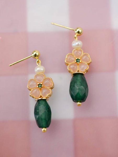 Pink Flower Dangle Earrings Enhance your style with these handmade mint flower dangle earrings. Each earring features a pink glass bead, a green jade gemstone bead, and a freshwater pearl bead, creating a delightful combination. These earrings are crafted with care and are free from nickel and lead, ensuring your comfort and safety. They are designed with a 5mm sterling silver post for a secure and comfortable fit. Please note that the beads used in these earrings may vary slightly, adding to their unique charm.