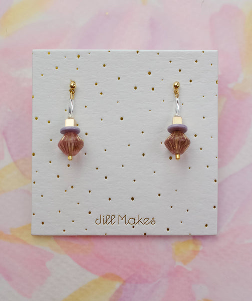 These handmade earrings feature a pink Czech bicone bead, complemented by purple, silver, and gold accent beads. Details: Earrings measure 1.5 inches in length. Gold plated over sterling silver earring post *Beads may vary slightly.