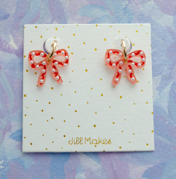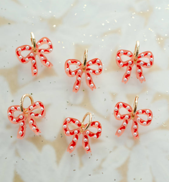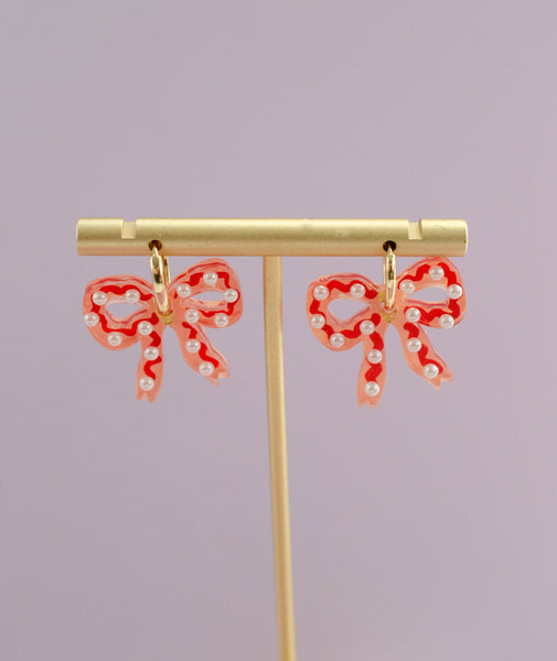 Hand-Painted Acrylic Bow Charm Earrings These bow earrings are hand-painted with pink and red details and accented with tiny pearl rhinestones. Each earring is lightweight and finished with a gold-plated loop. Their festive colors make them a great choice for the holidays or year-round wear! DETAILS: Hand-painted acrylic 14mm gold plated hoops Approx. 1 inch in lenght *Each pair may vary slightly due to the hand-painted process.