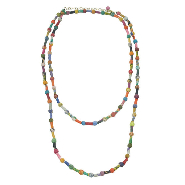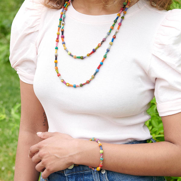 A perfect gift for Mother's Day! Cylindrical scrolled Kantha beads alternate with classic round beads for an interesting mix of shapes, colors, and textures. It’s delicate and lightweight, yet statement-making. Crafted from repurposed Sari and Kantha fabric, the colorful beads are all one-of-a-kind.