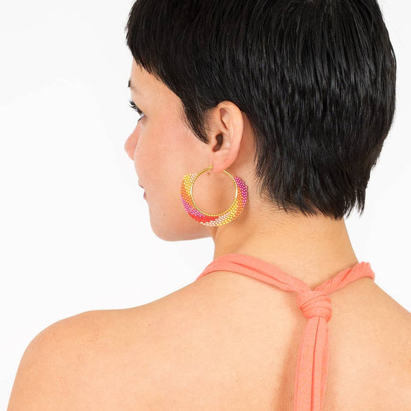 Swooshes of hand beaded colors create a multi-colored swirl on a gold plated brass hoop.